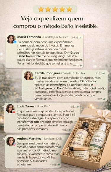 Por eso creé el método BAÑO IRRESISTIBLE, un sistema completo para crear una línea auténtica de sales de baño terapéuticas que tus clientes amarán, recordarán… y volverán a comprar.